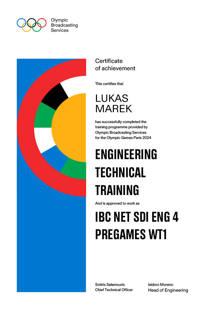 Během letních olympijských her v Paříži 2024 jsem pracoval jako IBC Network SDI Engineer, kde jsem byl součástí týmu Broadcast Engineering. Mým úkolem bylo zajistit bezproblémové fungování klíčových vysílacích infrastruktur v mezinárodním vysílacím centru (IBC), které sloužilo jako centrální bod pro distribuci televizního signálu globálním vysílatelům.